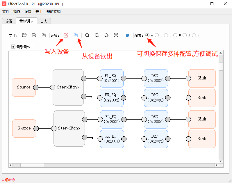 cpu/wl82/tools/cfg目录下,重新烧录的时候会将该文件烧写进设备,也可以点击加载配置文件加载文件里的配置。设备开机时,首先会读取加载烧录进设备的EQ文件,当打开在线EQ调试,会加载当前工具的配置,可以点击左上角将配置写入设备覆盖设备里旧的配置,也可以点击从设备中读取按钮读取设备配置。![]()