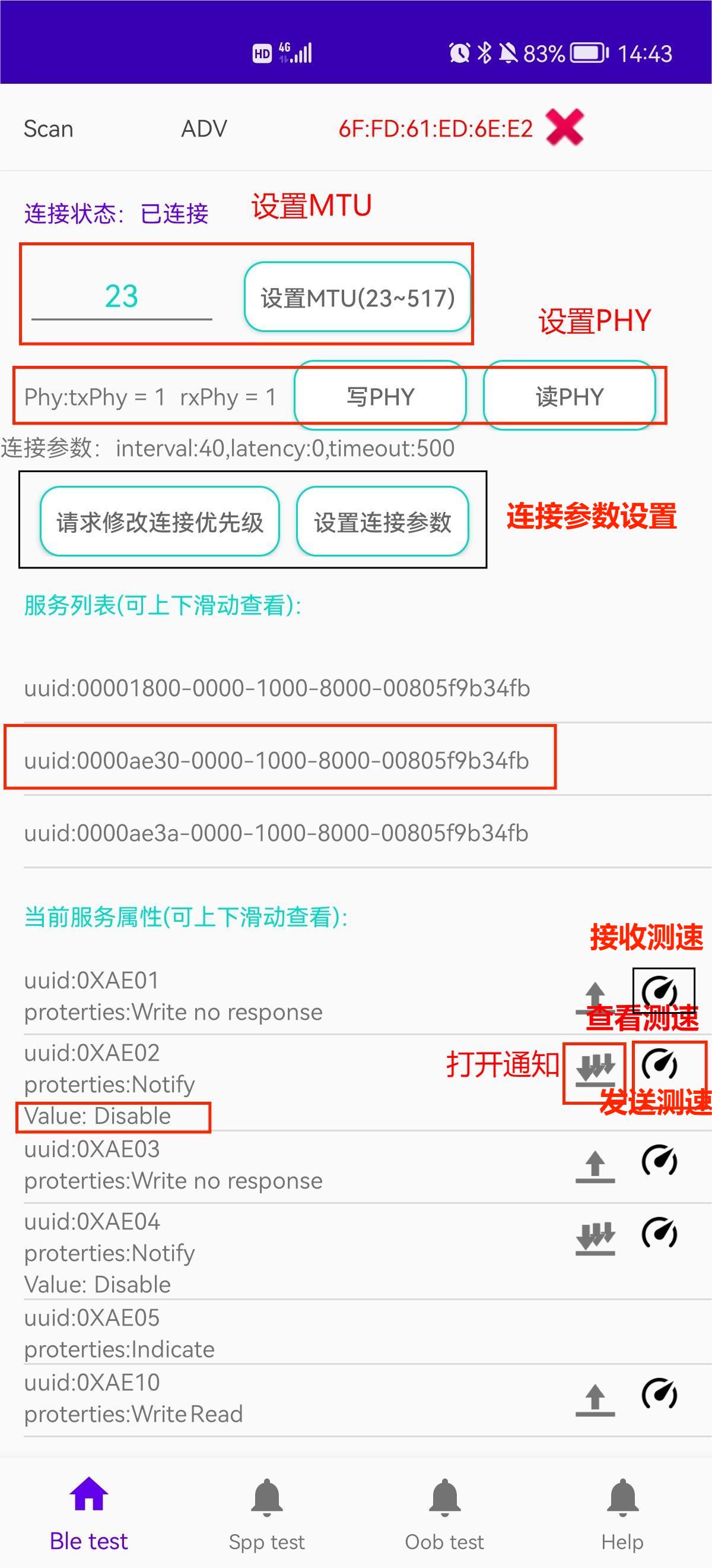 (2)点击连接以后会跳转到参数设置界面,可以设置MTU大小(23-517),设置PHY,查看连接参数,修改主机端连接参数