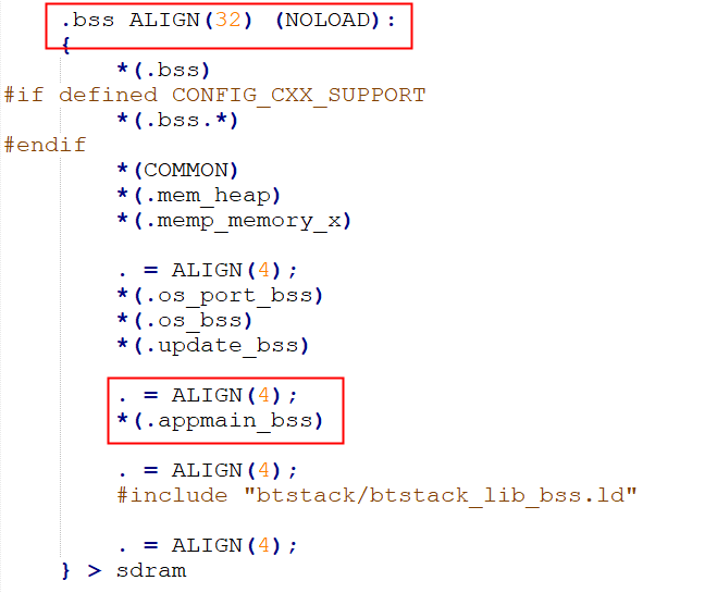 接着进入 cpu/wl82/sdk_ld.c 来指定 appmain_xx 存放的段。比如本示例中将 .appmain_data.appmain_const.appmain_str.appmain_code 节指定到 .ram0_data 中,将 .appmain_bss 节指定到sdram的 .bss 段中。