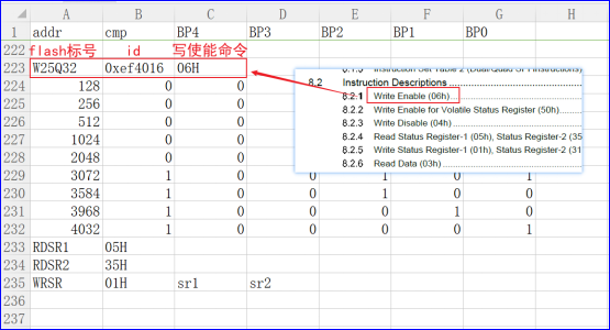表格找到上一组flash数据空两至三行后,在第一行填写flash标号、flash id以及写使能(Write Enable)指令。