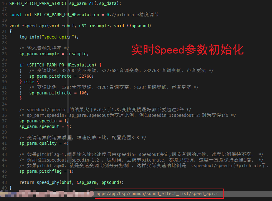 当const变量SPITCH_PARM_PR_HResolution = 0时,pitchrate = 128为不变调;小于128时音调变高;大于128时音调变高;当const变量SPITCH_PARM_PR_HResolution = 1时,pitchrate = 32768为不变调;小于32768时音调变高;大于32768时音调变高;Speedin / Speedout:变速比例,扩音应用下默认为1;