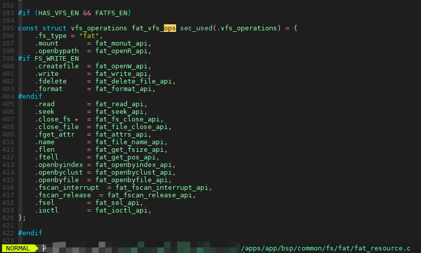 FatFs是一个通用的文件系统;在本机中,FAT不支持对FAT12、exFAT和sector大小大于512byte的FAT文件系统进行写操作,读操作正常;Simple_FAT为FAT裁切版,只能通过路径打开文件和读文件接口;FAT文件系统能使用的接口如下图所示:![]()