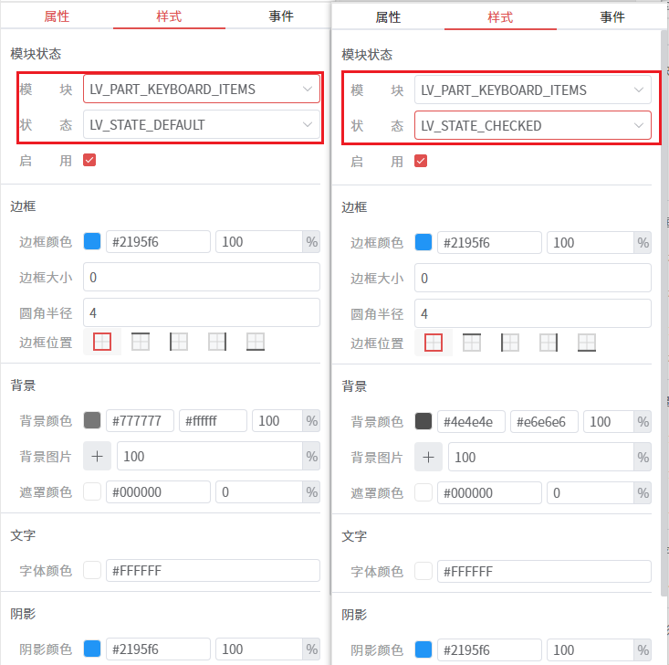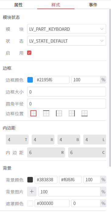 页面默认不启用 键盘 和 候选框 的样式,如果要启用,可以将 样式模块 切换到 LV_PART_KEYBOARD 、LV_PART_KEYBOARD_ITEMS、LV_PART_DROPDOWN_BOX 和 LV_PART_DROPDOWN_BOX_ITEMS 上,然后启用对应的样式。