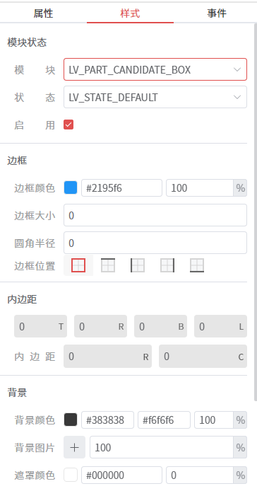启用 LV_PART_DROPDOWN_BOX_ITEMS ,来修改候选框项的样式,将背景透明度修改为 0,同时把字体颜色修改为 #FFFFFF