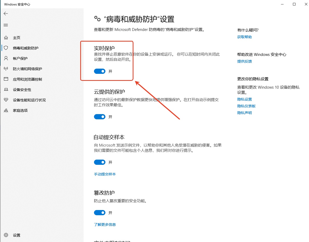 “病毒和威胁防护”设置,关闭实时保护。如下图: