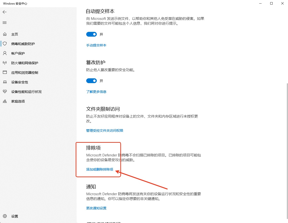 “病毒和威胁防护”设置,找到排除项设置, 点击添加或删除排除项。 如下图: