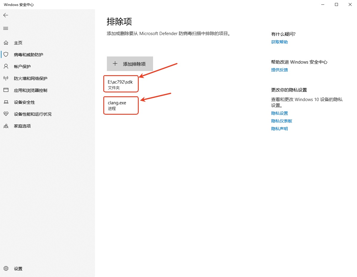 将编译器clang.exe进程和SDK路径添加到排除项中。如下图: