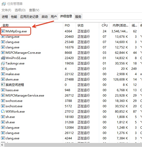 如下图,Windows系统自带杀毒软件进程MsMpEng.exe的CPU使用率最高