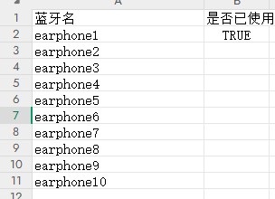 从第二行开始,第一列是蓝牙名,第二列是对应行数的蓝牙名是否已使用的标记。格式如下图: