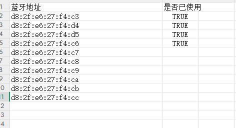 从第二行开始,第一列是蓝牙地址,第二列是对应行数的蓝牙地址是否已使用的标记。格式如下图: